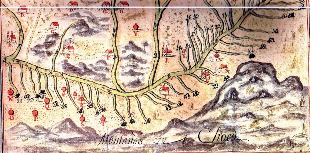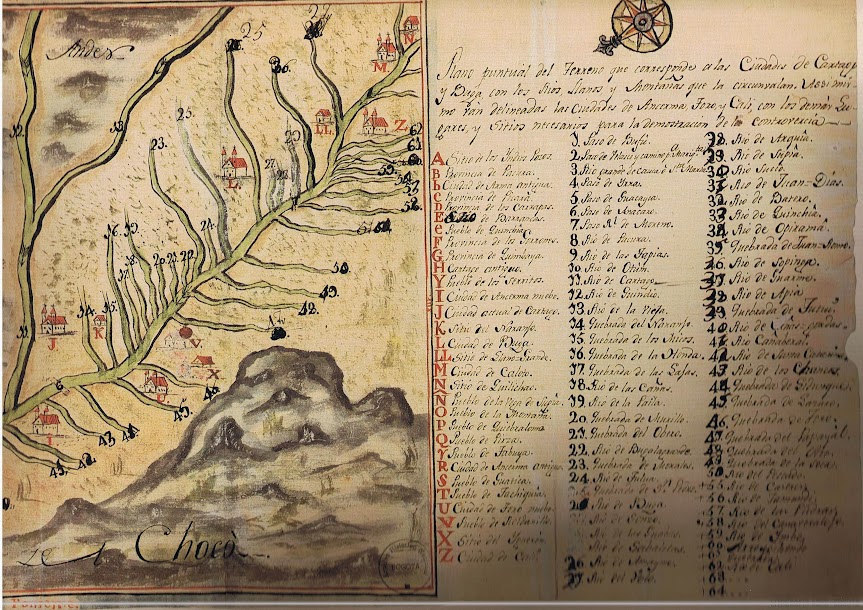 Al observar el detalle de la sección inferior izquierda (Fig. 2), el mapa ofrece información geopolítica vital. La inscripción «Montañas del Chocó» no es solo un accidente geográfico; marca el límite de la expansión agrícola del valle y el inicio de la frontera extractiva.
